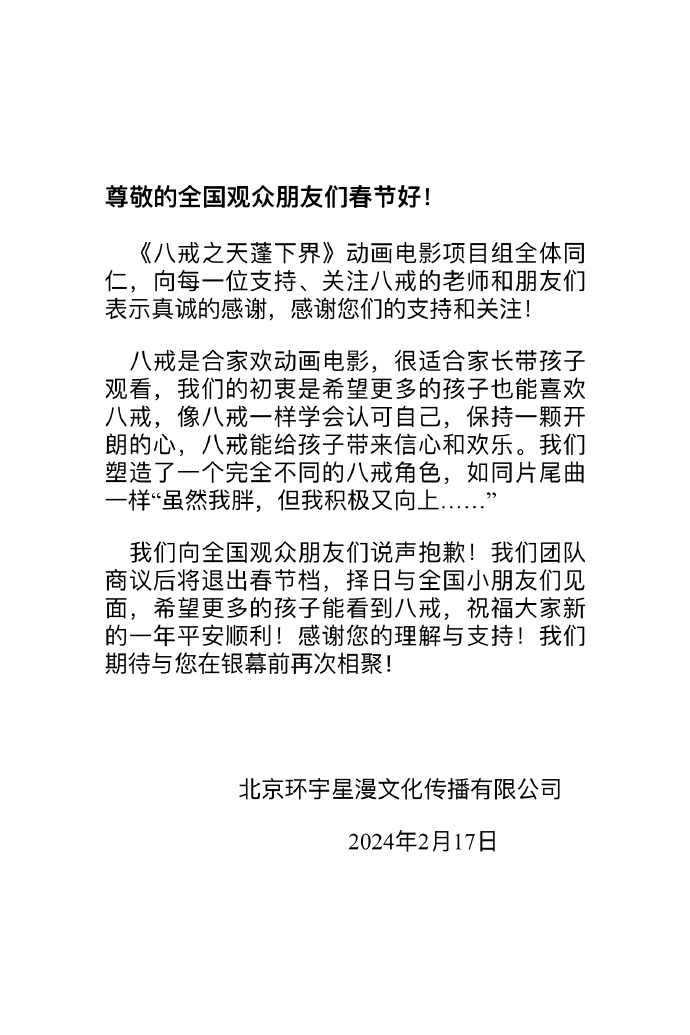 2月17日,@八戒之天蓬下界 微博发布声明,宣布电影《八戒之天蓬下界》将退出春节档。