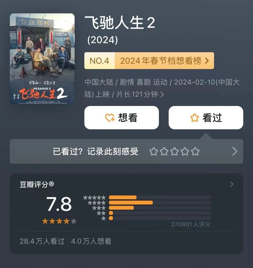 在今年春节档上映的几部电影中,《飞驰人生2》不仅创下了预售票房第一,首日上映票房冠军,总票房破20亿的佳绩,同时也作为当之无愧的口碑黑马,赢得了观影者的掌声,豆瓣评分也稳定在7.8的高分。