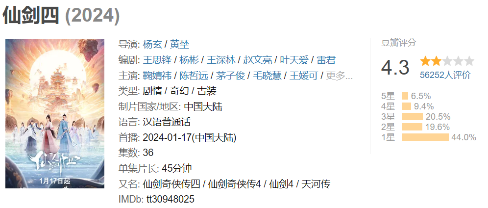 至于口碑……仙四最新豆瓣评分只有4.3。