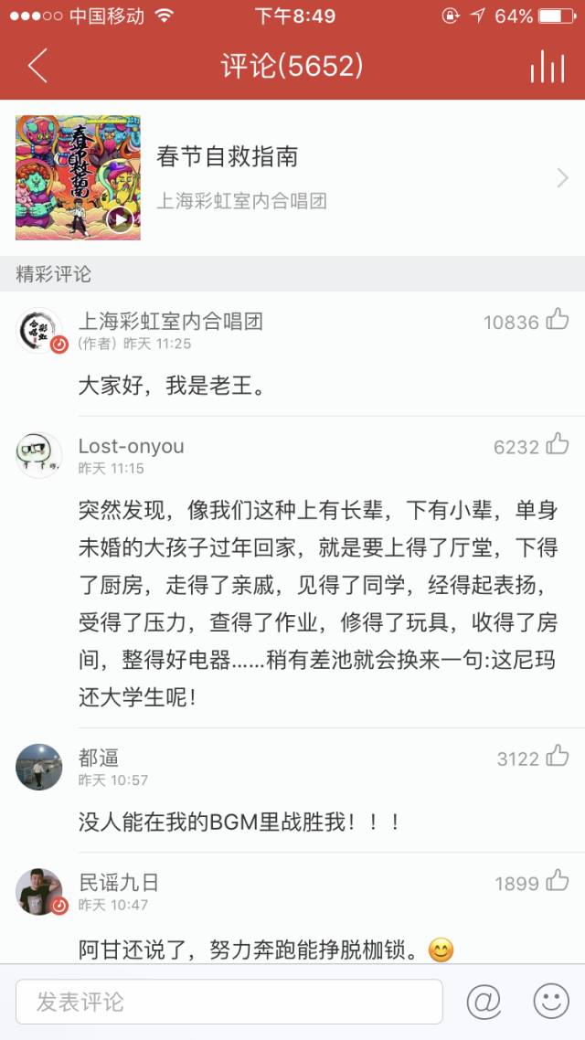 这首以年轻人春节回家为切入点的歌曲继承了上海彩虹室内合唱团自《张士超你到底把我家钥匙放在哪里了》以来,以古典音乐形式表达接地气话语的传统,伴随着开场的优雅圆舞曲像一把温柔刀深深扎进这个时代压力山大的年轻人心里,或笑或哭中引起共鸣。