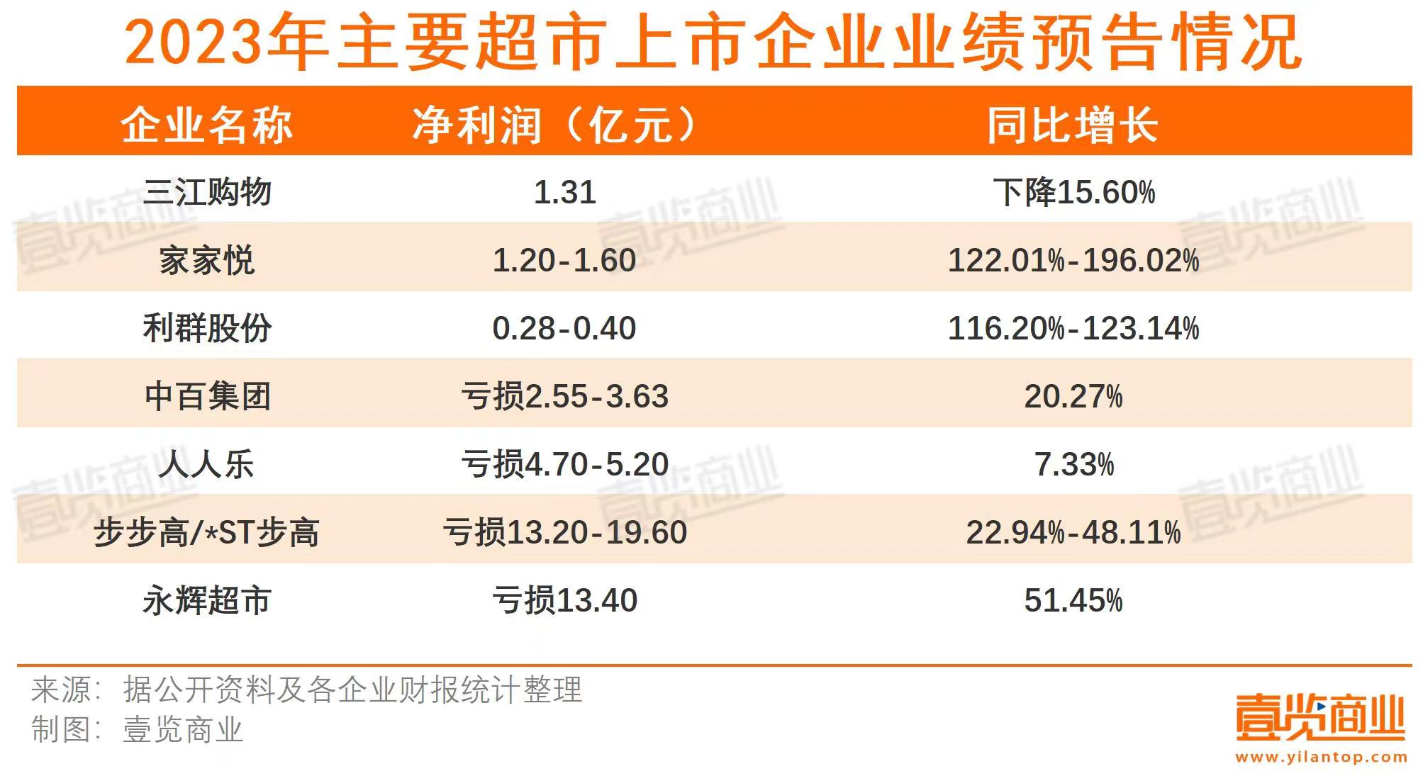 超市企业的数据,从同比增长的角度看,除了三江购物净利润同比下降15.6%,另外六家已公布业绩预告的超市企业净利润都有上涨。但除了三江购物、家家悦与利群股份是盈利状态,其他几家大型超市企业均面临巨额亏损,其中以永辉为最。2023年永辉预计亏损13.4亿元,亏损金额是三江购物盈利的十倍多。