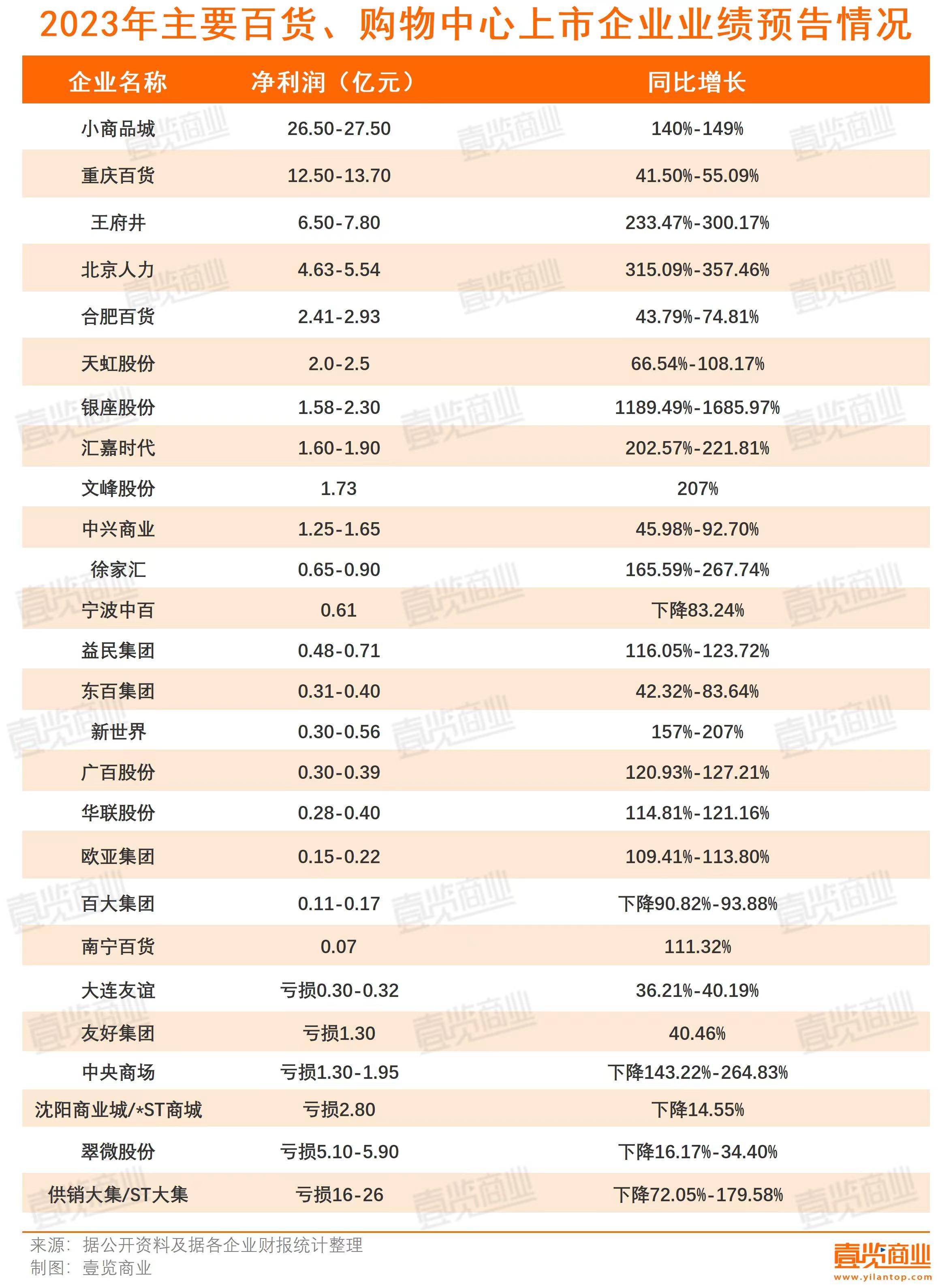 壹览商业发现,已公布业绩预告的26家企业里有20家盈利,包括南宁百货、欧亚集团、华联股份、广百股份在内的10家企业实现扭亏为盈。经统计,2023年已公布业绩预告的百货企业预计净利润为25.69亿元-45.18亿元。