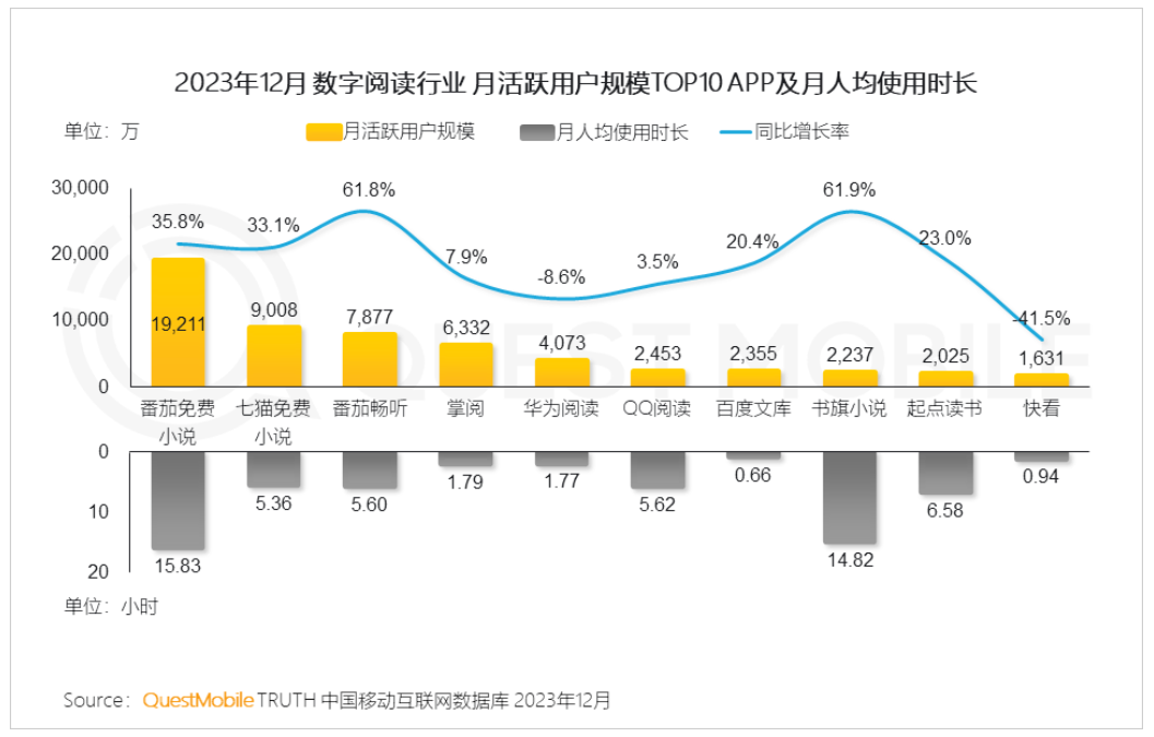 番茄小说已是国内数字阅读领域头部玩家。调研机构QuestMobile数据显示,番茄小说位列2023年12月国内数字阅读行业MAU(月活跃用户数)规模首位,MAU为1.92亿,同比增长35.8%;其后是七猫小说,MAU为0.9亿;掌阅以0.63亿的MAU排行第四,书旗小说和起点读书(起点中文网官方APP)以2237万和2025万分列第八和第九。