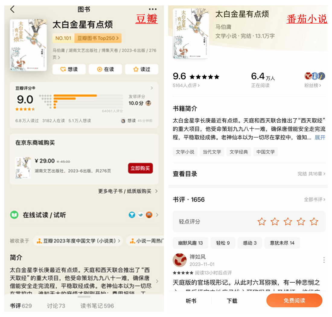 平台选择提升质量的方式之一是购买版权。此前番茄小说上线了来自掌阅、中文在线、书旗等平台的《元尊》《剑来》《神医嫡女》等知名网文,比如作者“烽火戏诸侯”的作品《剑来》首发于纵横中文网,豆瓣评分7.3分,番茄小说只是其免费渠道之一。写有《风起陇西》《长安十二时辰》的著名作者马伯庸,其新作《太白金星有点烦》发布纸质版外,电子版免费首发也在番茄小说。