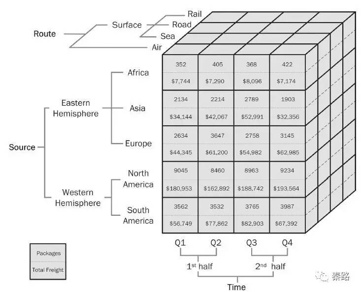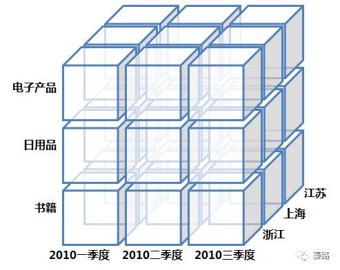 上图就是三个维度组成的数据模型/数据立方体。分别是产品类型、时间、地区。我们既能获得电子产品在上海地区的2010二季度的销量,也能知道书籍在江苏地区的2010一季度销量。