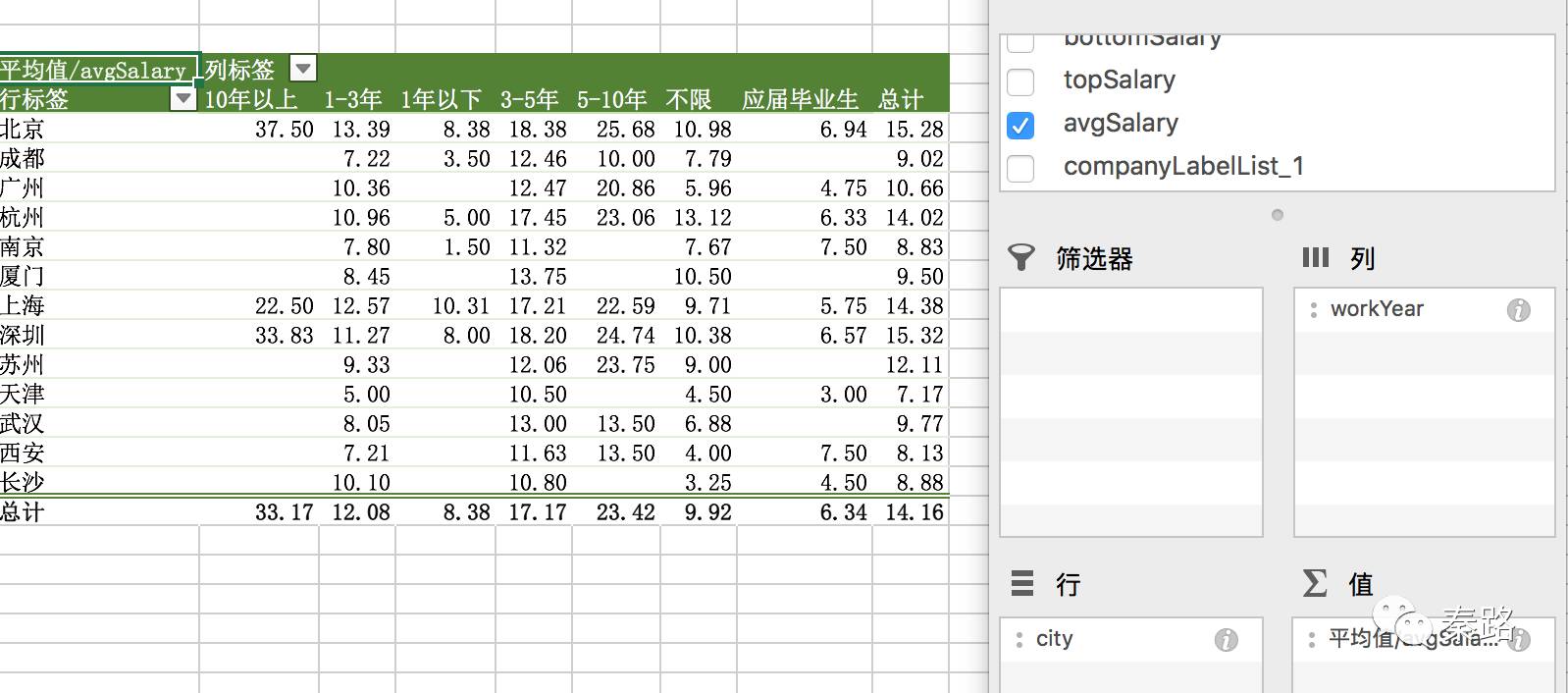 聪明的你可能已经想到,我们常用的数据透视表就是一种维度分析,将需要分析的维度放到行列组合进行求和、计数、平均值等计算。放一张曾经用到的案例图片:用城市维度和工作年限维度,计算平均工资。