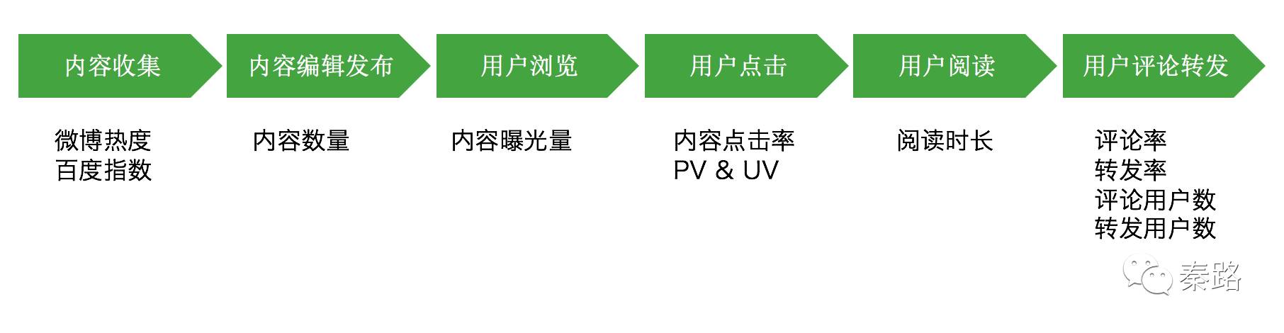 这是一个标准的流程,每个流程都有指标可以建立。内容收集可以建立热点指数,看哪一篇内容比较火。用户浏览用户点击则是标准的PV和UV统计,用户阅读是阅读时长。