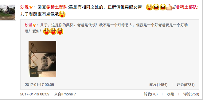1月19日凌晨,沙溢和章子怡就“醒醒和安吉撞脸”再次互动。早在1月17日凌晨,沙溢曾晒出自己在“微博之夜”获得的“微博年度综艺人物”奖杯以及自己和儿子的合照。翌日,章子怡在这条微博下调侃女儿醒醒和沙溢的儿子安吉撞脸:“儿子和醒宝有点像哦。”今日凌晨,沙溢回复章子怡的“撞脸说”:“美是有相同之处的,正所谓俊男靓女嘛!”