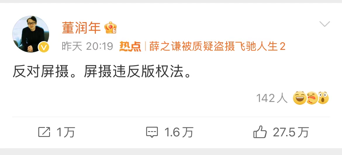 昨晚,《年会不能停》的导演董润年发布微博,表示“反对屏摄”,随后,微博热搜再次被屏摄霸占,热度盖过春山学。前十中有半数词条都与之有关。其中,“盗摄元年”登顶热搜,话题广场也是混战成一团,有坚决反对屏摄的,也有认为屏摄利于宣传、行业小题大做的。