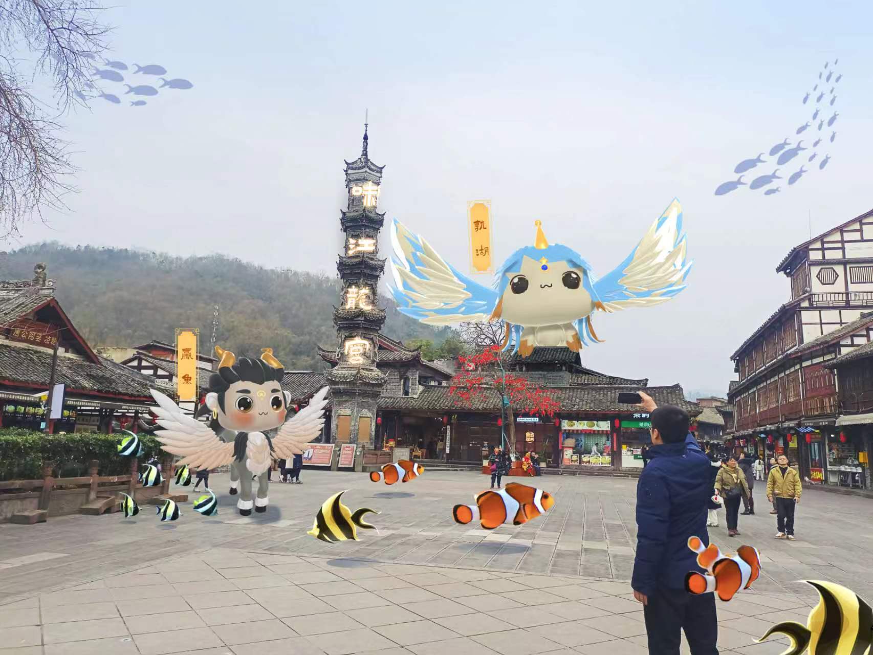 上述场景是街子古镇的AR“味江龙宫”,游客们只需登录“蜀州Walk”小程序,即可利用手机进入这个奇幻的虚实融合世界。