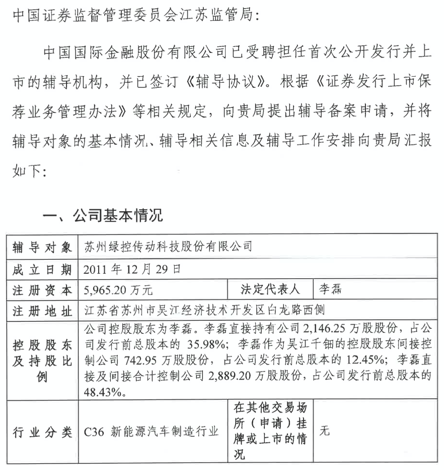据备案报告,中金公司已受聘担任首次公开发行并上市的辅导机构,辅导对象绿控传动,成立于2011年12月29日,注册资本5965.2万元,公司控股股东李磊,李磊直接持股2146.25万股,占发行前总股本的35.98%;李磊作为吴江千钿的控股股东间接控制公司742.95万股,占发行前总股本的12.45%;李磊直接及间接持股2889.2万股,占发行前总股本的48.43%。根据辅导相关信息,这次拟定的律师事务所是北京德恒律师事务所,会计师事务所为容诚会计师事务所(特殊普通合伙)。