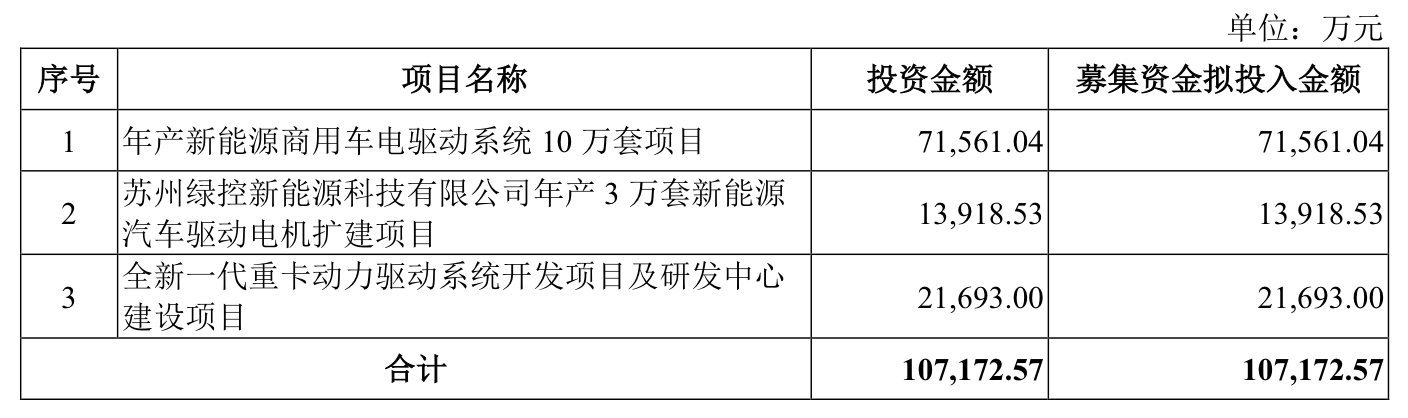 从披露来看,上一次,绿控传动是打算募资10.72亿元,投入“年产新能源商用车电驱动系统10万套项目”、“苏州绿控新能源科技有限公司年产3万套新能源”、“全新一代重卡动力驱动系统开发项目及研发中心建设项目”。
