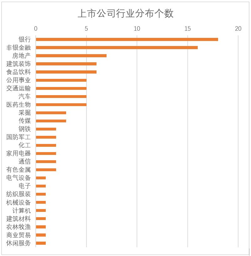 在地域分布上,北京以30家上市公司遥遥领先。这在一定程度上与不少央企总部在北京有很大的关系。排在其后的广东和上海也有很不错的表现,分别为20家和18家。这些地区也是中国经济最发达的区域。经济较为落后的区域,如云南、新疆等地只有1家上榜。还有部分偏远落后的省份则没有上榜。