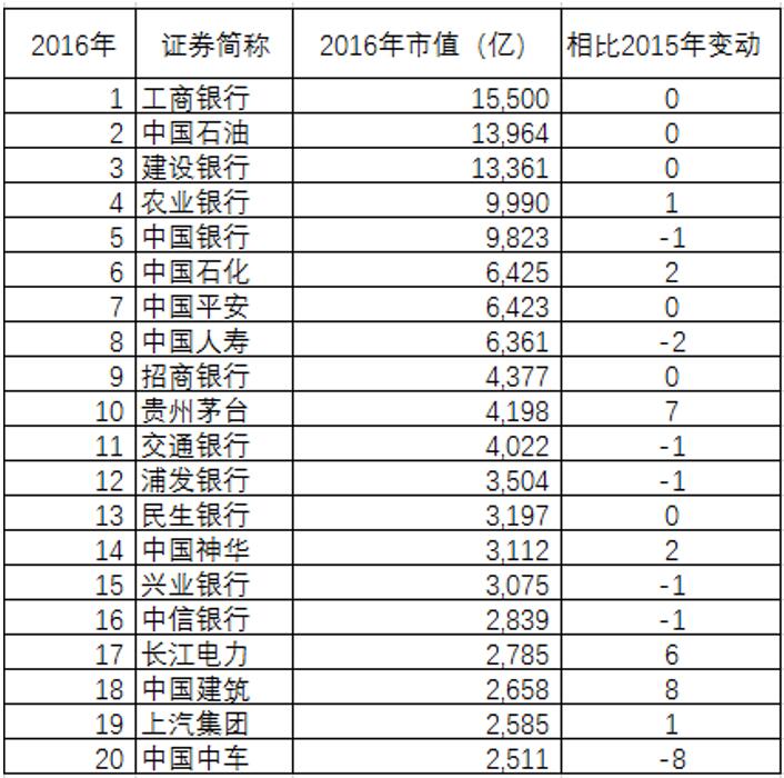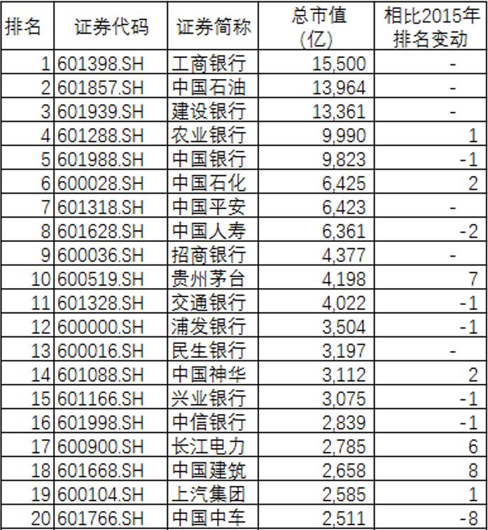 总市值排名前三的上市公司与2015年相比没有变化。四大国有银行之一的中国银行排名下降了一个名次。作为南北车合并的产物,中国中车的总市值相比2015年大幅下降8个名次。中国建筑则借助安邦保险集团的增持股价大涨,市值前进了8个名次。