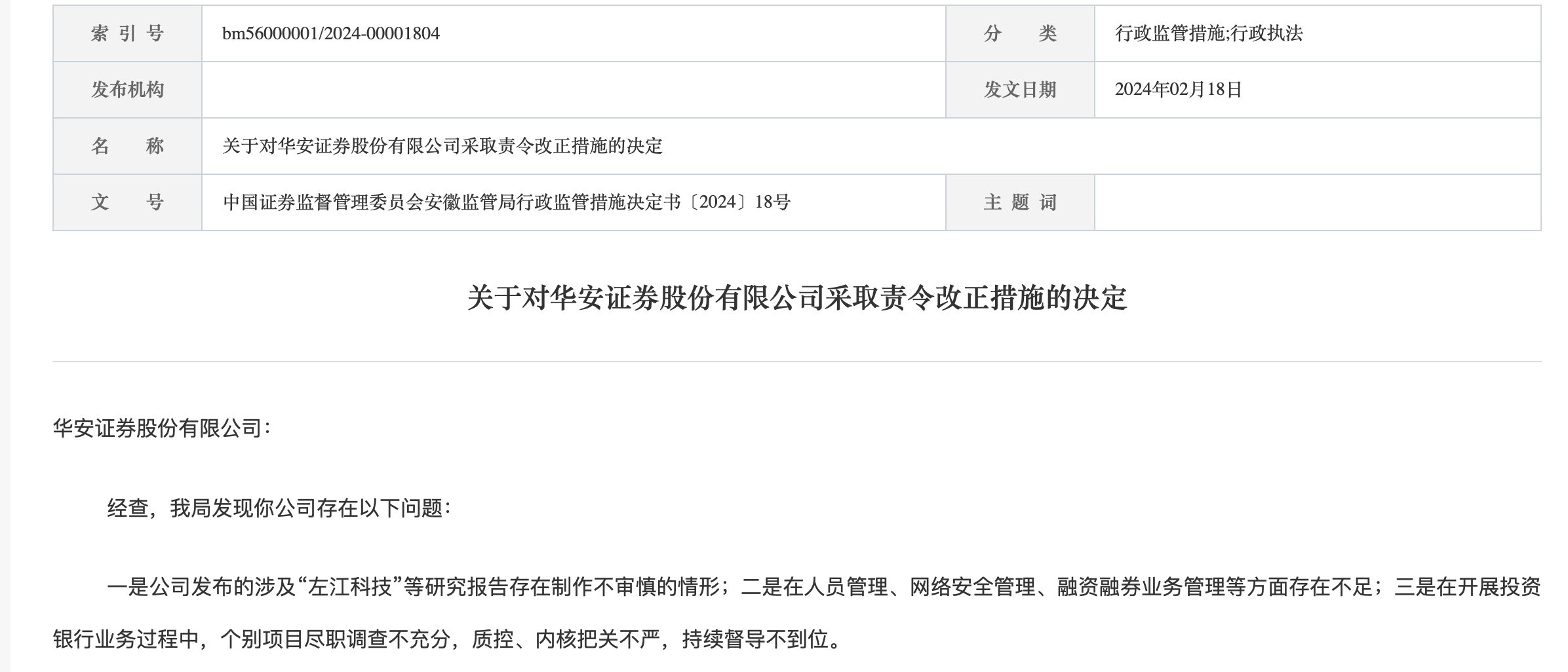 经查,华安证券存在三大问题。一是该券商发布的涉及“左江科技”等研究报告存在制作不审慎的情形;二是在人员管理、网络安全管理、融资融券业务管理等方面存在不足;三是在开展投资银行业务过程中,个别项目尽职调查不充分,质控、内核把关不严,持续督导不到位。