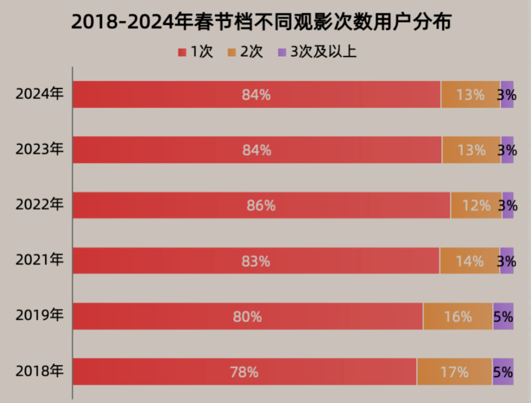 2024年整个档期观看一部电影的观众占比达到了84%持平往届,某种程度上,春节档依然是“一次性赌局”。观看两部和三部影片的观众占比分别为13.3%和2.2%。高于过去两年,但低于2019年和2021年。