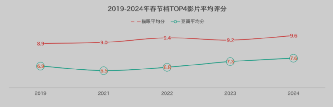 但是春节档电影整体质量提升的速度并没有追上电影评分“通胀”的高度。今年,六部主力春节档影片豆瓣均分达到了7.6分,这是非常罕见的。