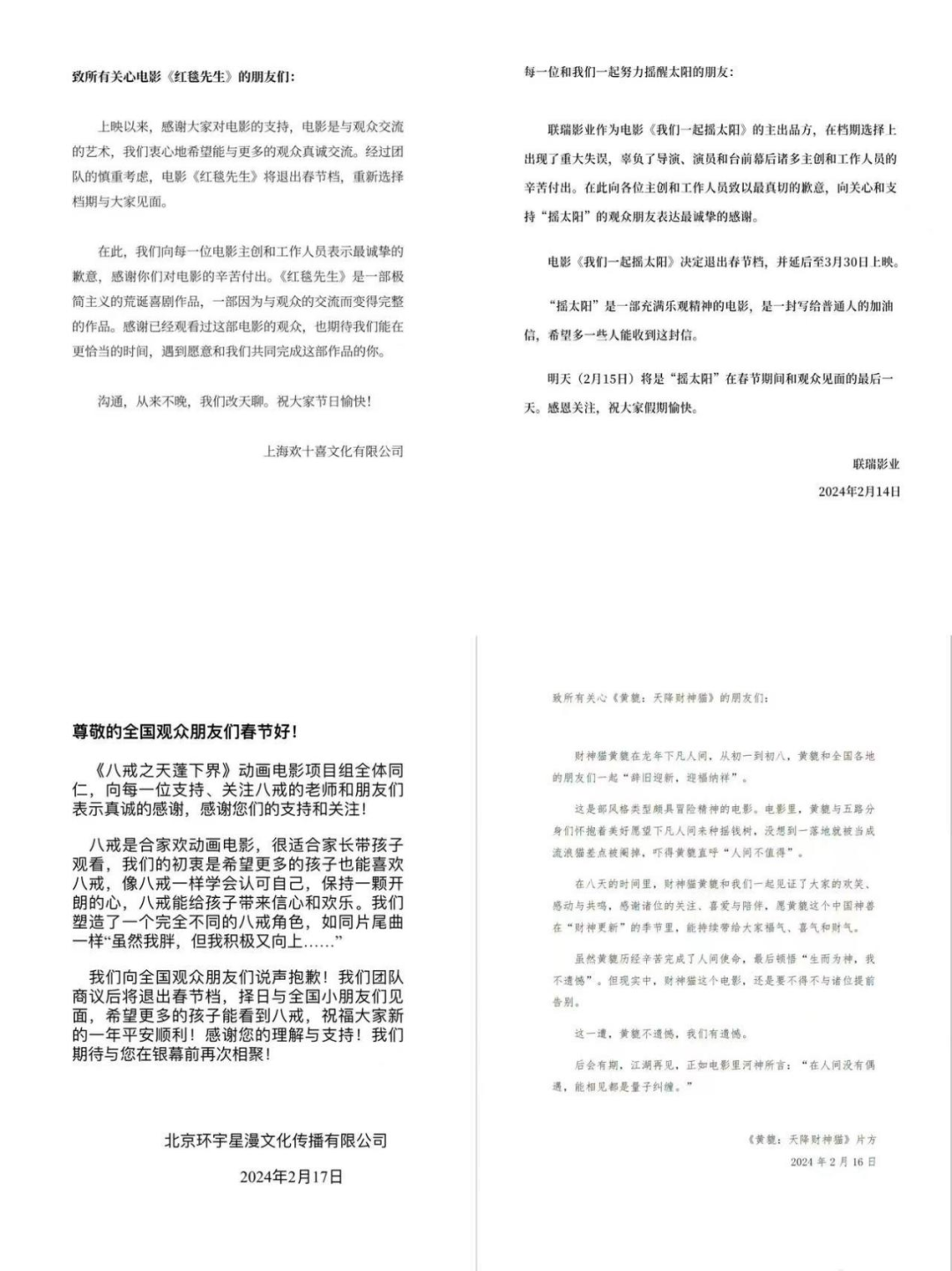 继《我们一起摇太阳》官宣改档之后,《红毯先生》也宣布将重新选择档期。加上《黄貔:天降财神猫》、《八戒之天蓬下界》,春节档有四部电影相继改档。