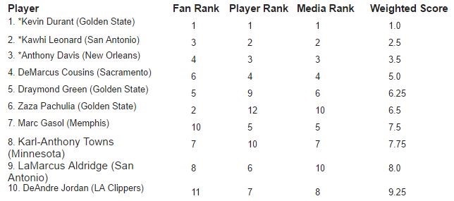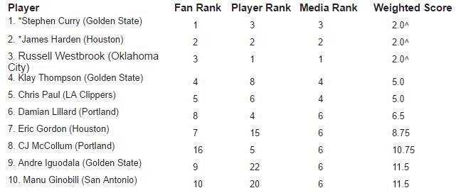 同分情况下,以球迷选票排名作为最终排名依据——这也是威斯布鲁克错失全明星首发的原因。西部的三位明星后卫库里、哈登和威少得分相同,其中威少被媒体和球员认定为西部最好的后卫,但是库里和哈登的球迷选票排名更高,得以挤掉威少,携手搭档西部首发后场。