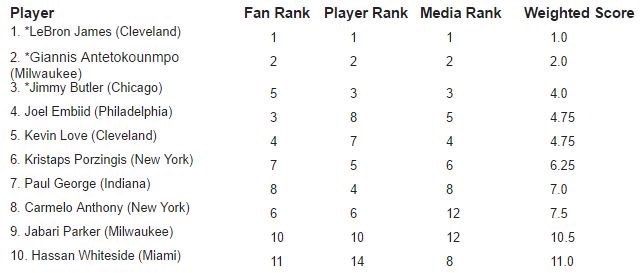 NBA官方今年在全明星投票方面做出改革,球迷所占权重从原来的100%降到了50%,媒体与球员分别占据25%的比例,投票可以从东西部联盟各选择三名前场球员和两名后卫。根据记票方法,最终的排名和获得票数没有关系,只和球员在三类投票中的排位有关系。