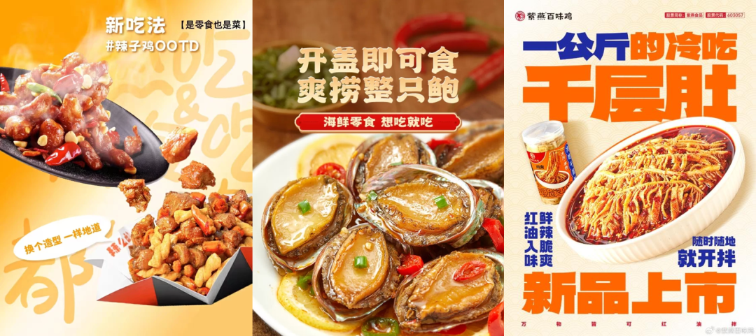 辣么卤力与川娃子联合推出即食版辣子鸡丁,打破零食与菜的界限;逮虾记推出捞汁鲍鱼,开盖即食,随时随地尽享美味小海鲜;紫燕百味鸡推出冷吃千层肚,香辣脆爽,随时享用。这些产品既是零食、也是加餐,对于消费者而言,卤味不再仅是鸡爪、鸭脖等,还演化出更加多样的卤味选择。