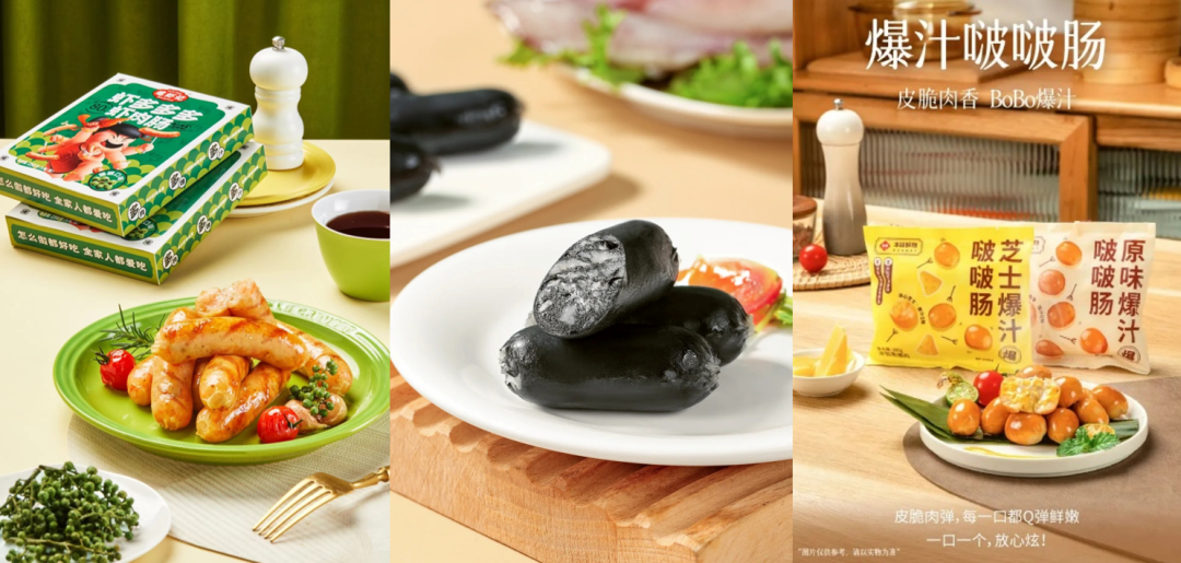 安井食品推出小巧墨汁一口肠,使用鲜香墨鱼汁调色,口感弹脆,肉香饱满;本味鲜物推出芝士爆汁啵啵肠,车达芝士的鲜甜奶香与肉香搭配,带来丝滑口感。