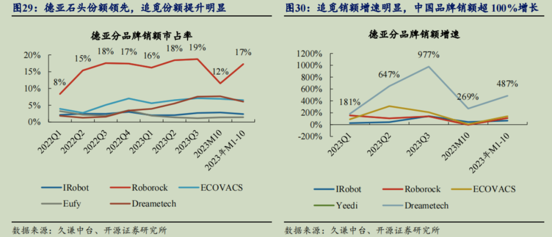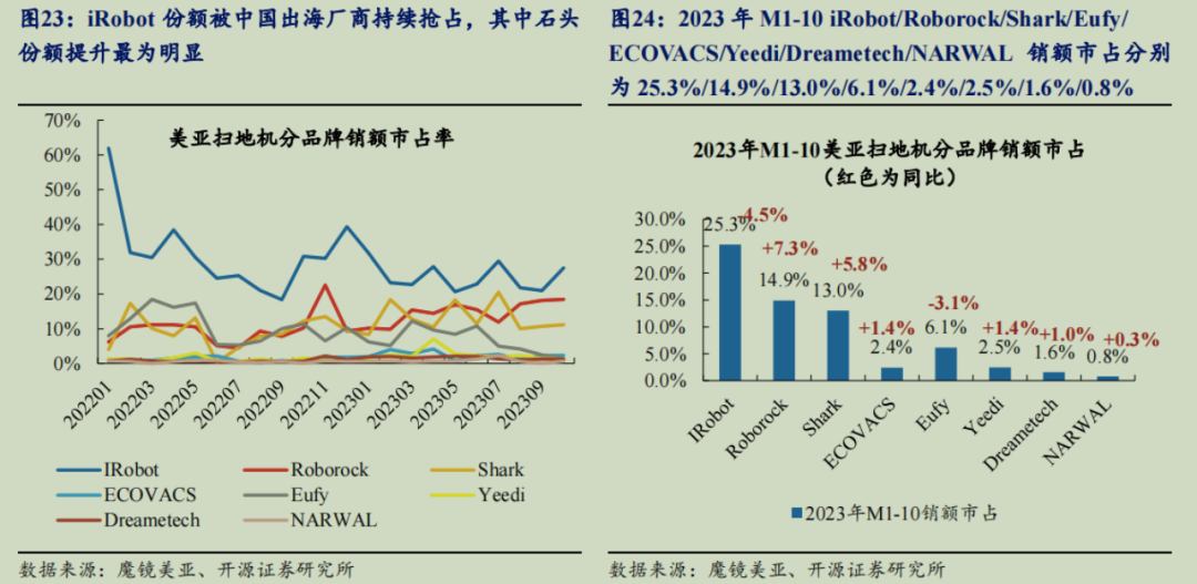 而在欧洲最大的德国吸尘器市场(含扫地机),中国品牌商的增长势头则已经完全展现。根据亚马逊德国2023M1~M10数据,石头、科沃斯、追觅、iRobot的销售额市占率分别为17%、7%、6%、2%,份额同比分别实现+3.7%、+2.0%、+4.4%、0;增速则分别是+111%、+141%、487%、66%,中国品牌商在德国市场销售额均实现翻倍增长。