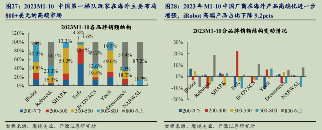 但,在这800美元以上的价格市场中,2023M1~M10期间iRobot、石头、科沃斯、追觅、云鲸的份额分别为11.6%、63%、9.3%、7.0%、5.5%,中国品牌商的合计份额达到85%,并且同比增长39.6%。