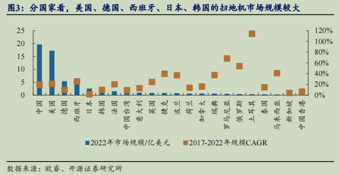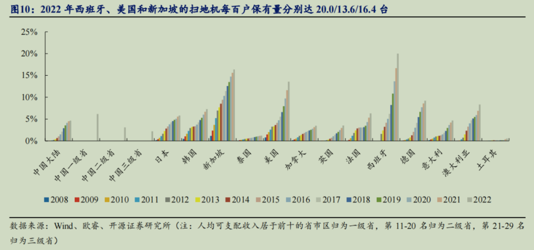 目前扫地机渗透率高的国家类似于西班牙、新加坡、美国、德国等,也基本介于10%~20%之间,但在这些国家中,扫地机均价占比居民年度可支配收入也不过1%,并且这一比例还有持续下降的趋势。