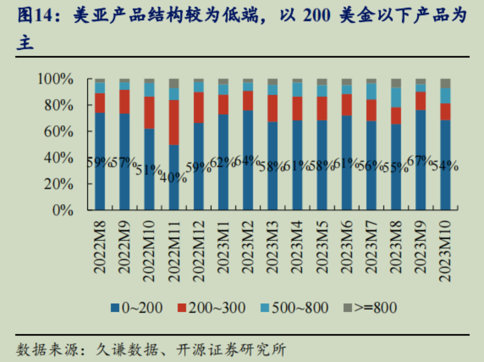 以扫地机第二大市场——美国市场为例,其亚马逊渠道结构数据显示,目前仍然有60%的比例为200美元以下的扫地机产品,800美元以上(高端价格线)的全基站产品占比可能不过10%,其市场的结构性变化迹象还未显现。