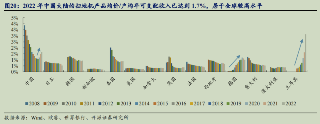 对比而言,我国的整体渗透率只在5%上下,但扫地机均价占比居民年度可支配收入已经超过2%,并且这一数字呈现不断上升的走势。