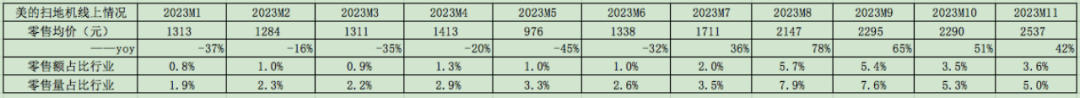 COLMO和小天鹅推出这个新产品大概是在2023年中期前后,根据奥维云网2023M1~M11数据,美的在扫地机线上的表现如下表。