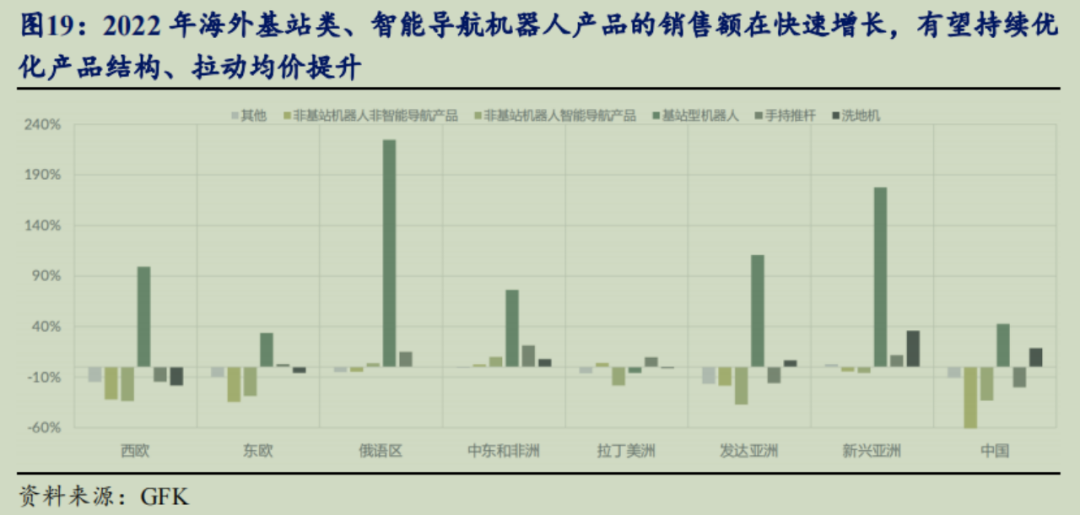 根据GfK、中怡康、NPD和Stackline数据统计,2023H1全球扫地机器人市场规模为27.6亿美元,同比下降4.9%;而这个时间段,中国扫地机器人市场规模为63.6亿元人民币,同比只下降0.6%。不过,与国内市场中全基站产品(价格基本在3000元以上)的渗透率超过80%相比,海外市场仍然以单机产品为主,这意味着即使在没有市场增量的情况下,海外市场内部的结构性变化(例如高端替代低端、基站产品替代单机产品)也会有比较大的结构性增长潜力。