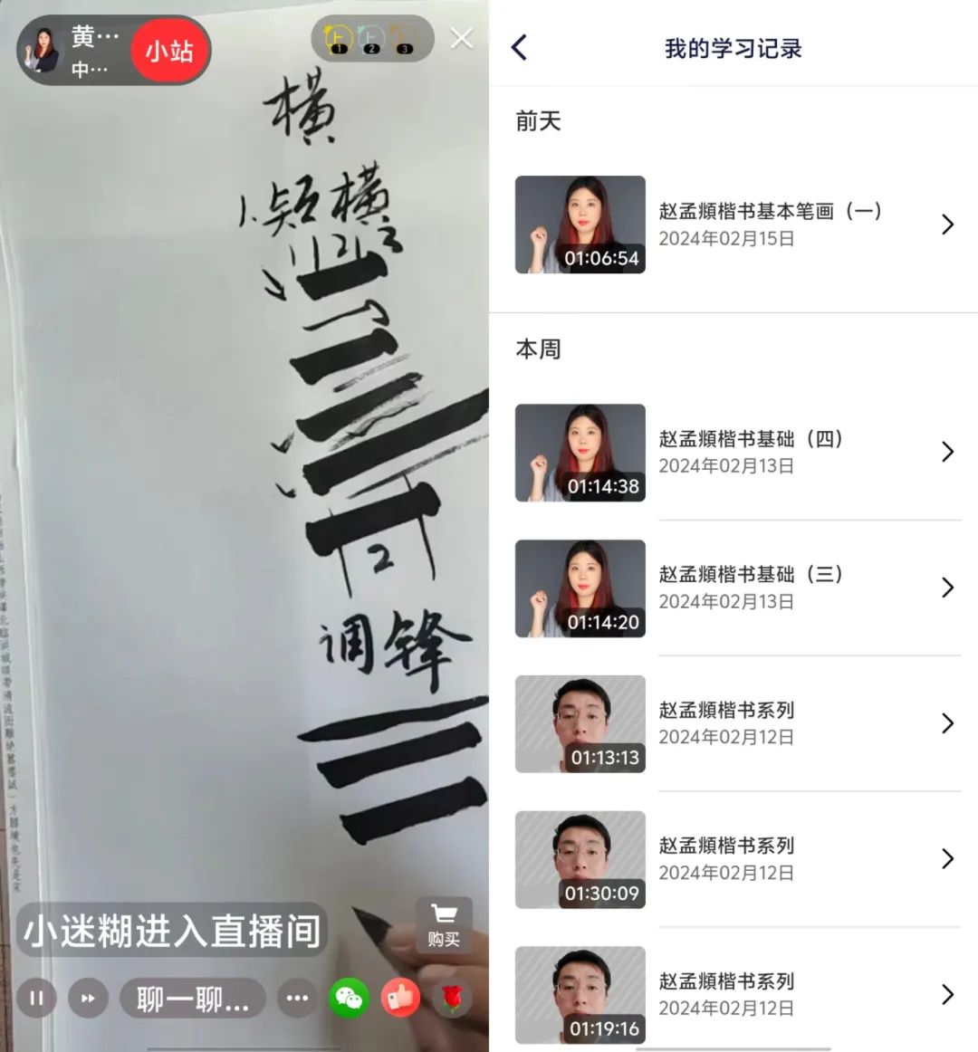 “同学们,注意回笔,不然会侧锋起毛边,起笔转,看我啊,这样提手腕,抬……”镜头对准的是桌面,搭配书写动作,还有一句句女声解说,讲解的分外细致。