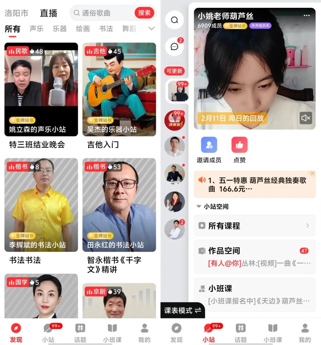 首页发现页,入目便是各种直播课程,声乐、书法、瑜伽、乐器、舞蹈、绘画……除了常见的兴趣,意料之外的也应有尽有,文化一栏有教面相学的,手工一栏不乏奶油胶和超轻黏土课程,棋牌除了围棋象棋还有德扑,形象礼仪里的美妆课赫然写着“眼线交流”。