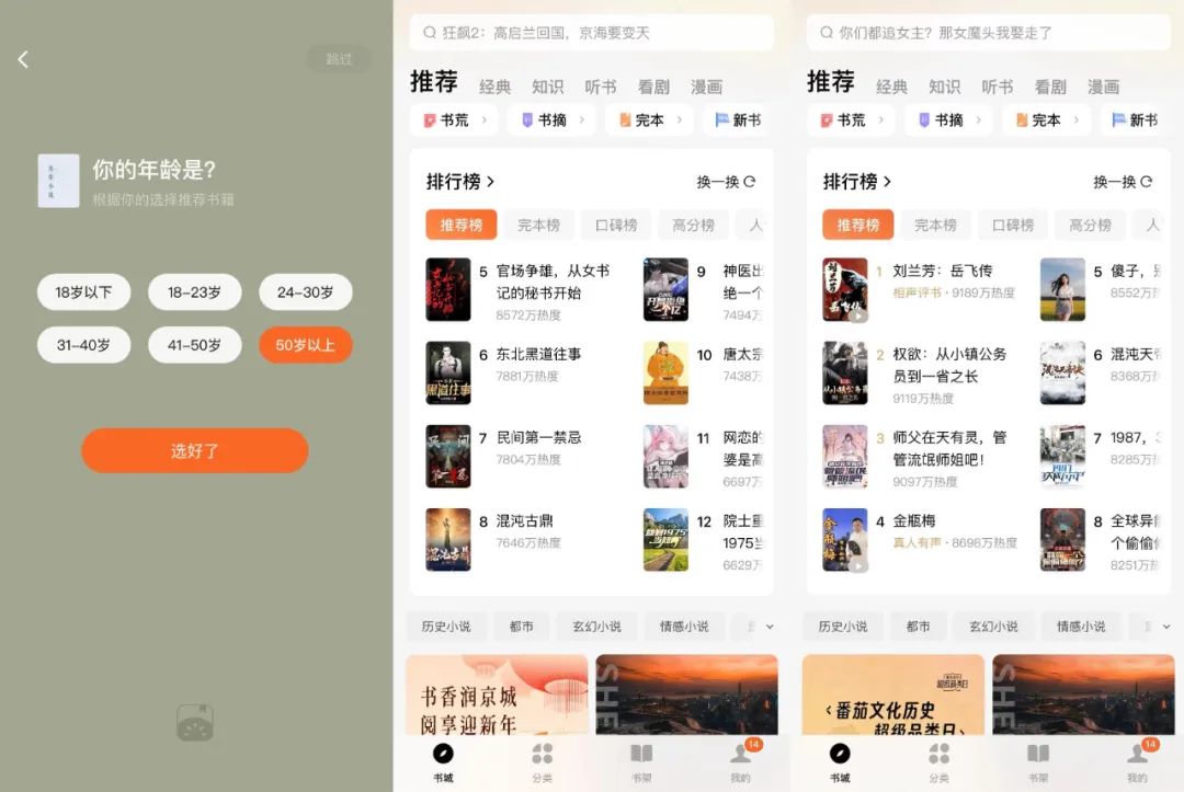 看起来,中老年人看网文的分类和年轻人也差不多,男频、女频,男性幻想成王称霸,王侯将相,女性无论什么年龄总会对细腻的情感内容更有感觉。我试着下载番茄小说,把用户偏好设置成男性、50岁以上,平台主推的内容包括官场文学、隋唐演义、东北黑道往事这些内容,和表妹介绍的情况基本一样。