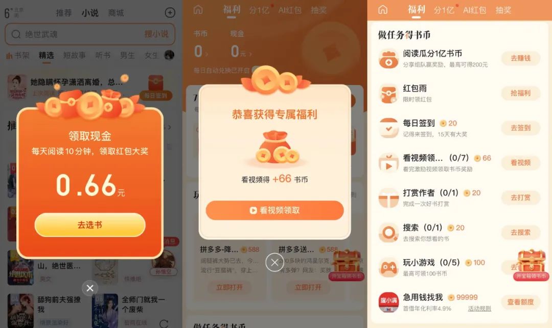 出于好奇我打开百度小说页面看了看,平台也有付费内容,但设置了很多减免优惠的勾子吸引用户,比如要看视频、玩游戏赚书币,无非多等两三分钟,长辈们是可以接受的。现在在百度看小说还能挣钱,点进百度小说页面,立刻会弹出「每天阅读10分钟,领取红包大奖」的页面。