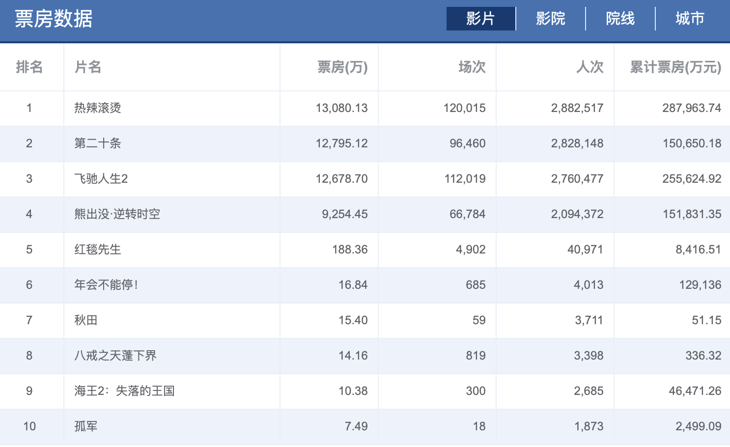 票房前4名影片分别为《热辣滚烫》、《飞驰人生2》、《熊出没·逆转时空》、《第二十条》,国家电影专资办数据显示,截至2月19日下午14时30分,四部电影累计票房分别为28.8亿元、25.56亿元、15.18亿元、15.07亿元。