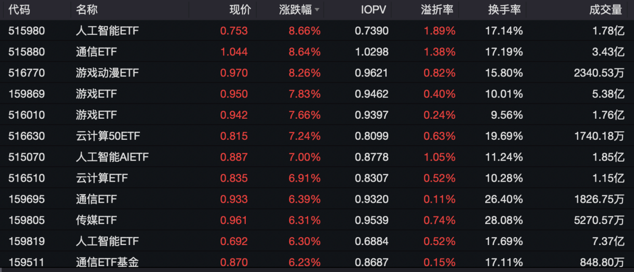 传媒、游戏、人工智能等主题ETF涨幅超5%,其中人工智能ETF(515980.OF)、通信ETF(515880.OF)、游戏动漫ETF(516770.OF)涨幅超8%。人工智能ETF(159819.OF)成交额达7.37亿元,游戏ETF(159869.OF)、通信ETF(515880.OF)成交额分别为5.38亿元、3.43亿元。