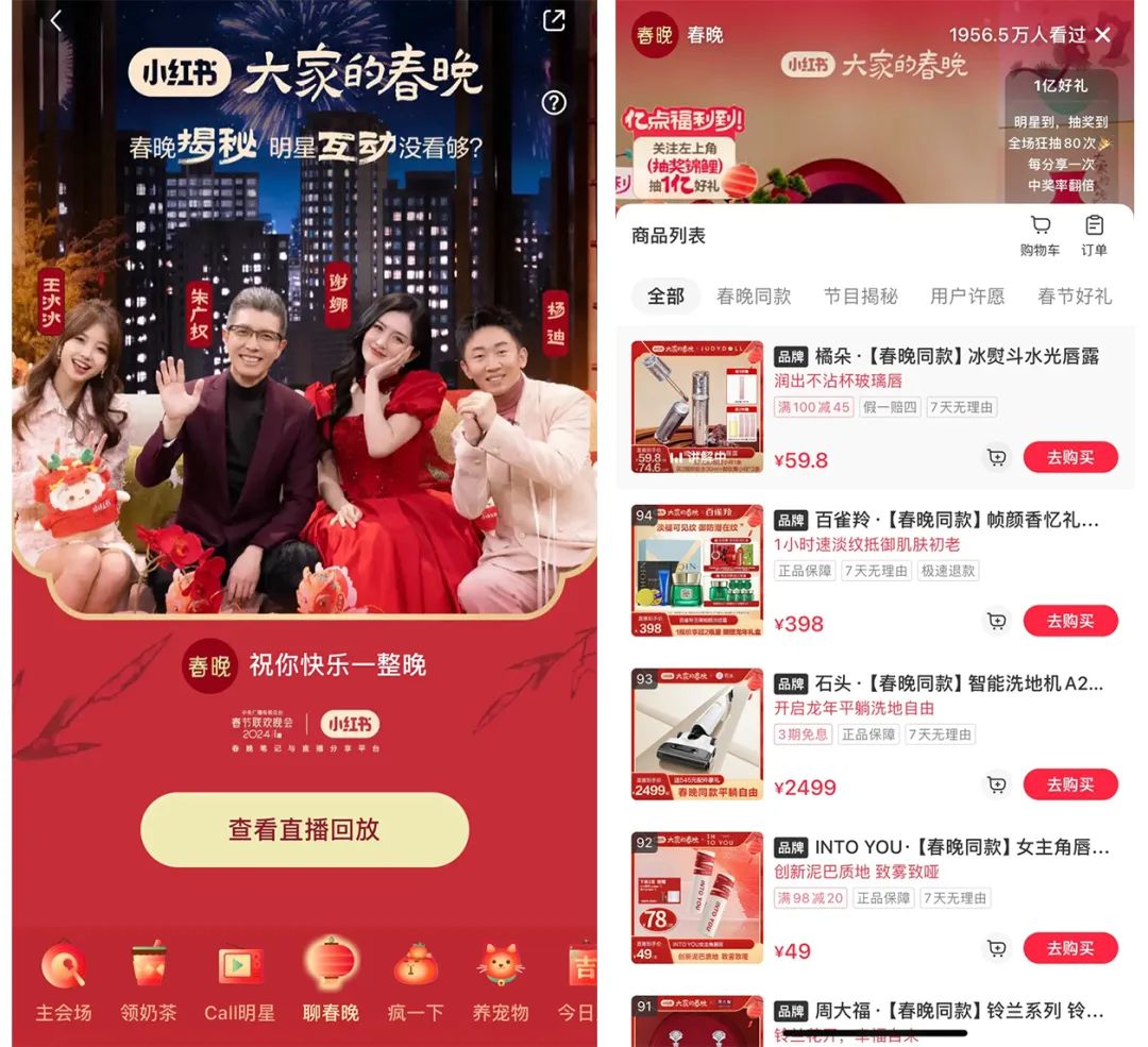而此次春晚广受大家关注的营销事件还有小红书和中央电视台联合发起了一场陪伴式直播——“大家的春晚”,通过直播间同步上架春晚同款商品链接的方式,首创“边看边买‘的电商直播模式。