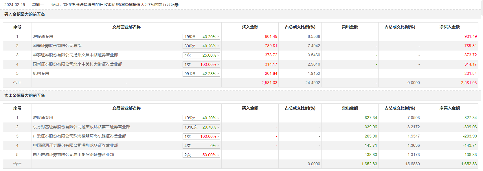 具体来看,机构合计净买入201.84万元。此外,沪股通专用、华泰证券总部分别买入901.49万元、789.81万元;沪股通专用、东方财富证券拉萨东环路第二证券营业部分别卖出827.34万元、339.06万元。