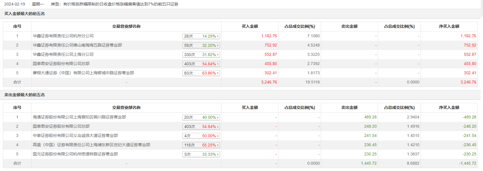 具体来看,华鑫证券杭州分公司、华鑫证券佛山南海海五路证券营业部分别买入1182.76万元、752.92万元;海通证券上海普陀区铜川路证券营业部、国泰君安证券总部分别卖出489.28万元、248.20万元。