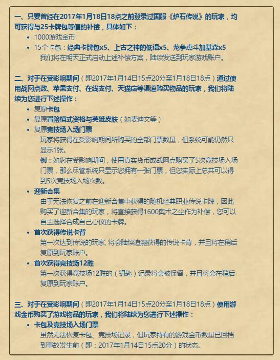 1月19日中午,暴雪网易公布了补偿措施。除去所有在事故期间进行购买的玩家能够全数返还消费外,国服所有玩家都还可以获得15卡牌包以及1000金币的补偿,目前补偿已经开始陆续发放。