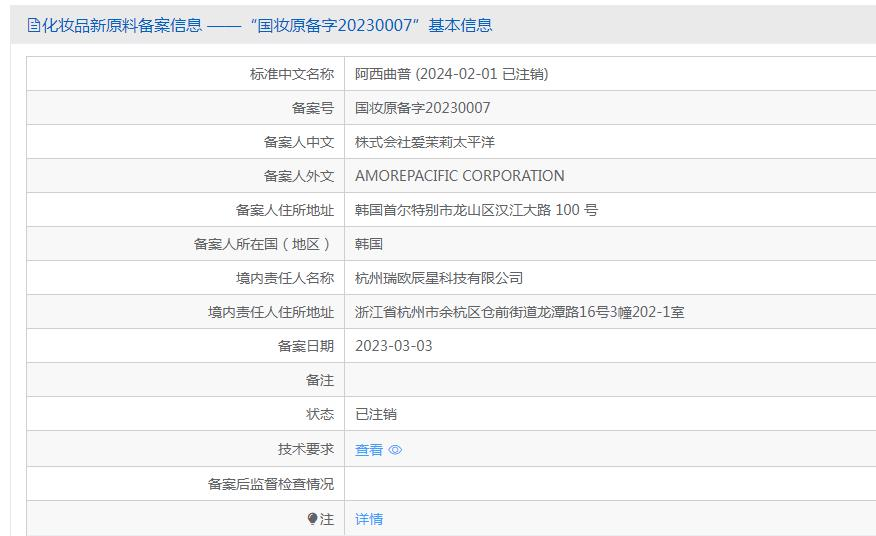 根据国家药监局公布的新原料信息显示,去年3月3日,爱茉莉太平洋注册备案了一款名为“阿西曲普”的新原料,备案号为“国妆原备字20230007 ”,该原料的境内责任人为杭州瑞欧辰星科技有限公司(下称:瑞欧辰星)。这也是目前爱茉莉太平洋在我国备案的唯一一款化妆品新原料。