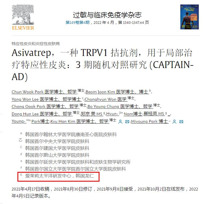 多位研发工程师告诉青眼,Asivatrep是爱茉莉太平洋研发的特异性的TRPV1拮抗剂,并已经顺利通过了临床I和II试验。早在2021年10月,关于该成分的临床III期试验结果就已发表在过敏/免疫领域顶级期刊J allergy clin immunol上。论文标题为《Asivatrep,一种 TRPV1 拮抗剂,用于局部治疗特应性皮炎:3 期随机对照研究 (CAPTAIN-AD)》,“爱茉莉太平洋研发中心”即是该论文的作者之一。