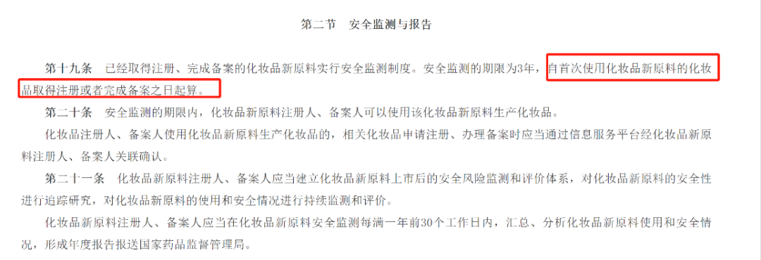 另据《化妆品注册备案管理办法》第十九条规定,“已经取得注册、完成备案的化妆品新原料实行安全监测制度,安全期限为3年,自首次使用化妆品新原料的化妆品取得注册或者完成备案之日起算。”