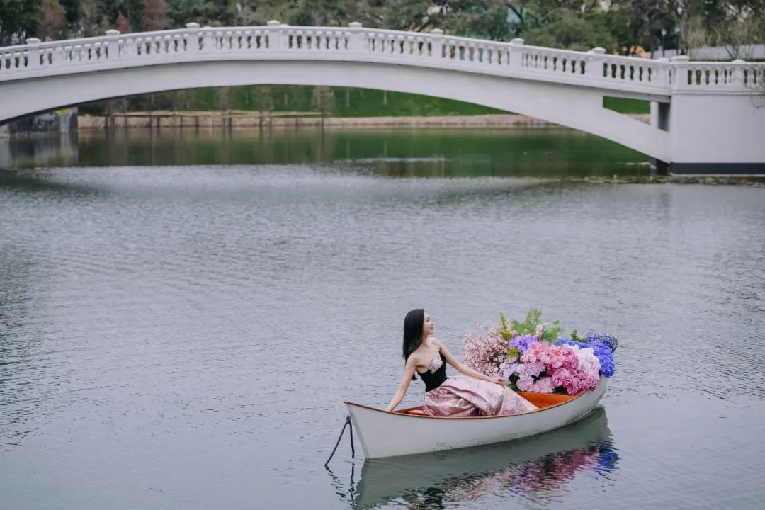 日月湖上,盛满繁花的小舟悠悠飘荡,偶尔船桨划过水面,声音仿佛是大自然最美的合奏。在自然主义装置的点缀下,园中树木开出繁盛的花,一步一景。