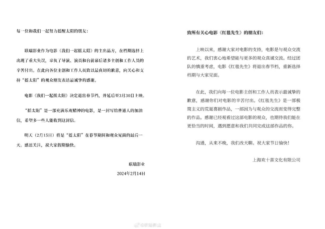 (《我们一起摇太阳》《红毯先生》宣布延期上映)