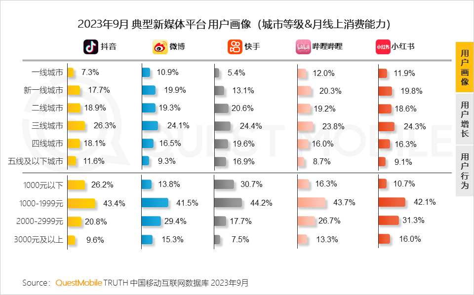 根据Quest Mobile 2023年9月数据显示,抖音、快手两大典型的短视频平台,三、四、五线城市的用户增长是各城市等级中增长前列,分别为26.3%、18.1%、11.6%和24.4%、19.6%、16.9%,远高于一二线城市。