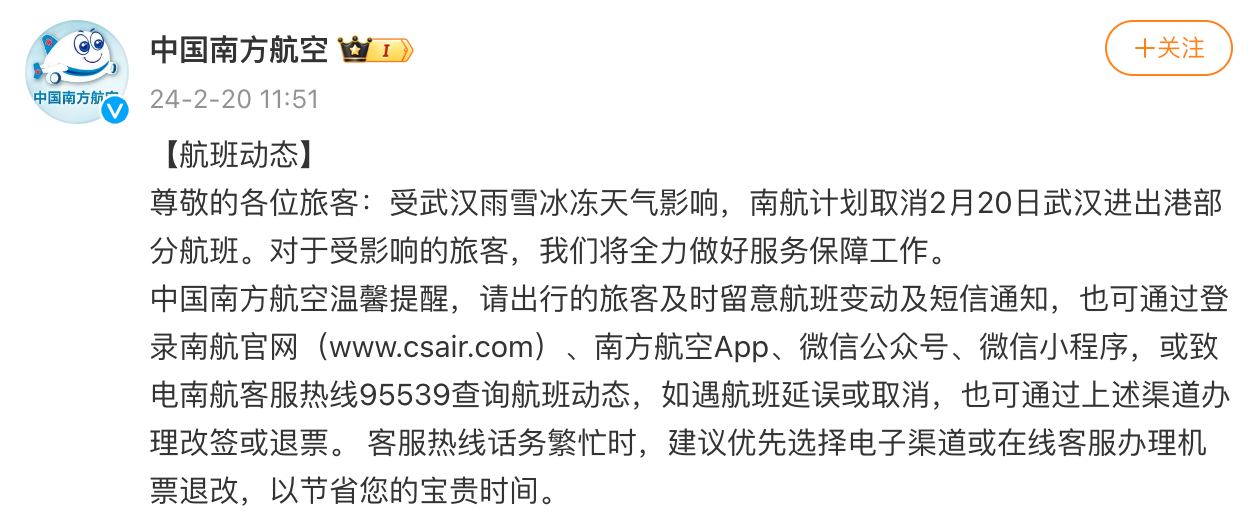 @中国南方航空 微博消息,受武汉雨雪冰冻天气影响,南航计划取消2月20日武汉进出港部分航班。对于受影响的旅客,公司将全力做好服务保障工作。
